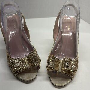 Kate Spade NY Heels Slingback Shoes Open Toe Bow Glitter Metallic Gold Size 10