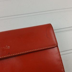 Kate Spade NY Smooth Leather Full Size Checkbook Wallet Red. Pre-owned condition. The logo is faded. There is a pen mark on the front flap. There are some scratches on the exterior and interior leather. There is some corner wear. Measures approximately 7.5x4. Please see photos for detailed condition.