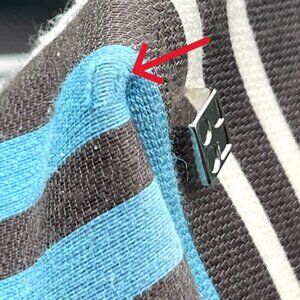 This authentic Kate Spade New York tote bag showcases a striking striped design in blue, dark brown, and white tones, crafted from premium Italian canvas. It features genuine dark brown leather handles with reinforced white contrast stitching, giving it both style and durability. The interior is lined with sturdy beige cotton material, offering practical organization with multiple slip pockets and a zippered compartment for everyday essentials. The bag measures approximately 9" tall by 11" wide by 9" deep, making it ideal for work, travel, or daily use. The bag is in gently used condition, with minor corner fraying and a small mark on one handle, visible in the detailed photos (see pictures with red arrows). Hardware remains shiny and intact, while all stitching and branding are clean and crisp. Perfect for fans of luxury and timeless design, this tote is ready for continued stylish use and practical carrying.