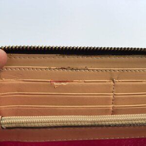 The wallet's interior has 12 slots for the credit cards, 2 slide pockets and one zip pocket in the middle also there is a slide pocket in the back of the wallet.