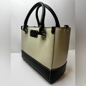 Chic Kate Spade satchel with a stylish black and cream design. Features sturdy handles and a detachable strap.