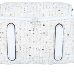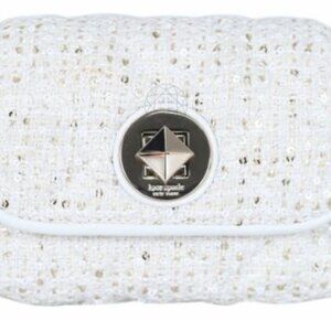 New with tags, white multi natalia sequin kate spade tweed fabric micro bag. Long chain strap meant to be worn as a crossbody, this micro version comes with a turn lock and is the perfect size to carry keys, a lipstick, and credit card.