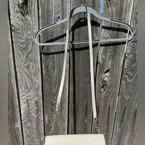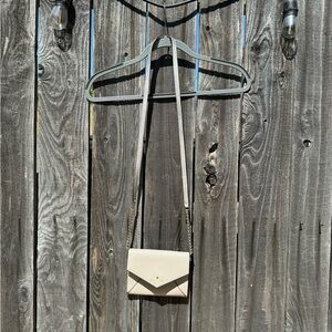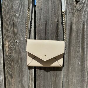 Small cross body leather envelope purse with gold chain, gold snap closure and Kate Spade written in gold on the front. One large pocket with small interior slide pockets for cards