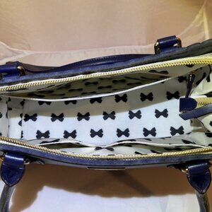 Kate Spade Navy Blue Leather & Beige Linen Scallop Detail Satchel