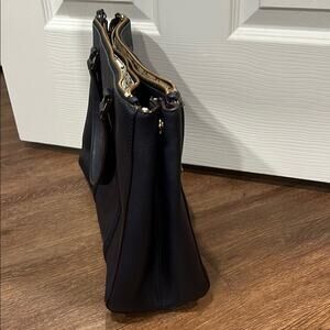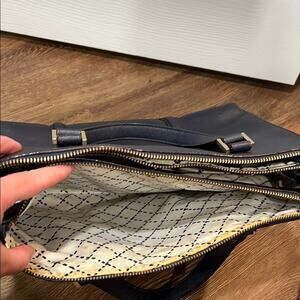This sophisticated Kate Spade satchel in navy blue features a structured design with gold-tone hardware, offering a timeless and versatile look. Crafted from high-quality leather, it maintains its shape beautifully, making it perfect for both professional and casual settings. The bag's sleek silhouette and adjustable shoulder strap add to its practicality and style.