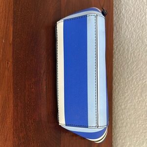 Chic pouch with navy and white stripes. Secure zip closure. Perfect for essentials.