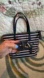 Elegant tote with bold stripes. Features 1 front zipper pocket, 2 outside side pockets, 1 inside zipper pocket, 3 more inside pockets, and a hidden zipper pocket on top along back of bag. Has attached tote handles and a separate long handle for crossbody or shoulder. Has the Kate Spade navy satiny lining, all with gold tone zippers and clasps. Ideal for daily use, travel, or out on the town.