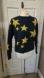 Chic Kate Spade wool blend navy sweater with bold yellow metallic stars. Ideal for a playful look.