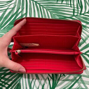 Features: zip around, gold tone hardware, leather stitching design on front, 12 credit card slots, inner zip pocket, exterior slide pocket