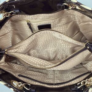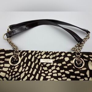 Kate Spade New York Animal Print Silver Chain Handle Shoulderbag Black/Cream Color with Silver Logo and 3 Compartment:Sentral Compartment Zip Closure/1 Compartment had 2 Slip Pockets/1 Compartment has Zip Pocket Approximately Measurement: 15”/12”/6” Length Handle 22,5” No Flaws,No Marks or Stains Excellent Condition