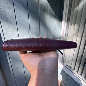 Classic and durable, this Kate Spade wallet is crafted from scratch-resistant Saffiano leather in a rich red-burgundy hue. Perfect mix of elegance and practicality!