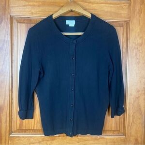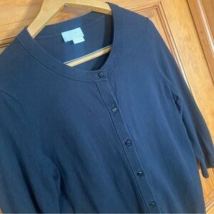 Super cute Kate Spade New York Live Colorfully 7-buttoned front cardigan sweater!! It is in the color black and is very lightweight and soft. The bow design on the sleeves are unique and classic Kate Spade! Very slight pilling on sides and worn tags but nothing overtly noticeable.