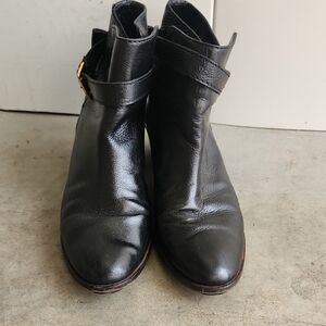 These black leather ankle boots feature a sophisticated design with a decorative gold-tone buckle on the side. short, stacked wooden heel.