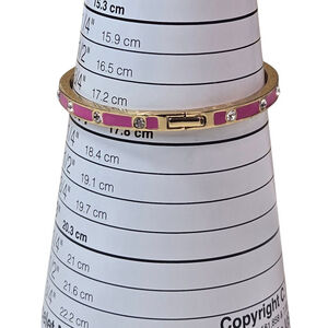 This is a collectible Kate Spade New York hinge bangle bracelet, featuring a gold-tone finish with pink enamel segments and clear crystal accents. The bracelet measures approximately 6 3/4 inches (17.2 cm) in circumference, as indicated by the sizing cone. It has a hinged closure for easy wear. The interior is engraved with "kate spade NEW YORK". Visible signs of wear are minimal, consistent with a gently used item. Excellent condition.