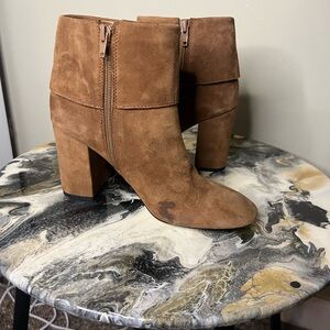 Absolutely beautiful soft suede boot with bow detail in the ankle. Sturdy block heel makes walking easy. These shoes have never been worn outside a store. However, there is a small ~1 inch stain/flaw on the inner side of the left foot along the sole. Please see photos.
