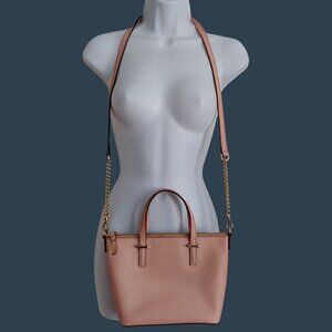 Mini shopper-style bag featuring removable cross-body chain strap, double top handles, footed bottom, polished hardware and Kate Spade Logo