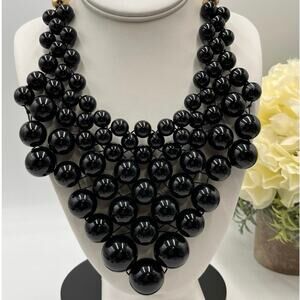 A brilliant bib of dazzling dots is just the anecdote for a high, simple neckline. Necklace is approx. 20" (including a short extender) with large black ball beads strung on black thread or wire into a statement bib design. Bib is large, measuring approx. 9" wide and 5" deep. Piece has a lobster clasp. This necklace is absolutely beautiful with a nice weight and gleams in the light nicely.