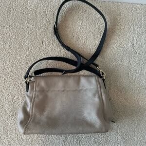 There are SO many compartments and pockets on this bag! Fold over flap features zipper pouch that extends the length of the bag. Magnetic closure on flap. Interior cell phone pockets. Neutral tan color with black accents to match anything and everything. Excellent condition. No flaws.