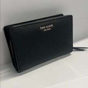 This is a wonderful Kate Spade New York Compact Vertical Snap Bifold Zip Around Wallet. Goldtone hardware. Snap opens to 8 credit card slots, an ID window, 4 additional slip in compartments, a currency slot, a zipper opens to anothet double compartment. Fully satin lined. No odors. No tears. 5.5” x 3.5”