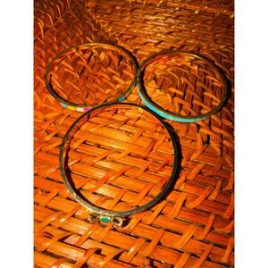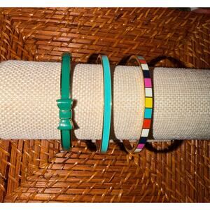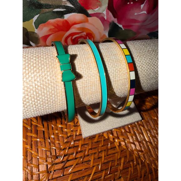 Super cute set of 3 Kate Spade New York enamel bangles. Includes signature bow bangle, turquoise enamel bangle, and colorful stripe enamel bangle. Perfect for stacking or wearing individually.