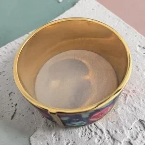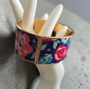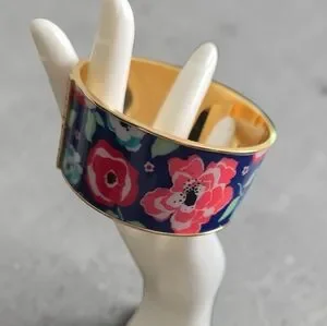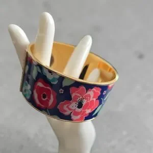Design: Wide bangle featuring vibrant floral prints (roses and clovers are common) on various background colors like navy blue or kelly green.