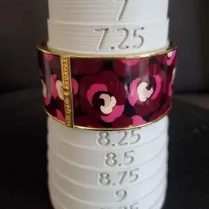 Keywords: Floral, Enamel, Preppy, Designer, Retro, Mod, Bold, Statement, Colorful, Burgundy, Pink, Gold Tone, Stackable, Chic, Feminine