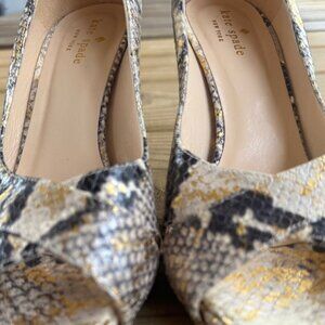 Keywords: Kate Spade heels, snakeskin leather pumps, metallic gold peep toe, Italian designer shoes, luxury women’s heels
