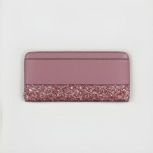 Gorgeous pinkish purple glitter metallic wallet — the perfect mix of glam and function. Compact yet roomy enough to hold your essentials like cards, cash, and coins. Features Kate Spade’s signature chic design with a multicolor shimmer that catches the light beautifully. Ideal for adding a pop of sparkle to your everyday look or a night out!
