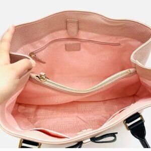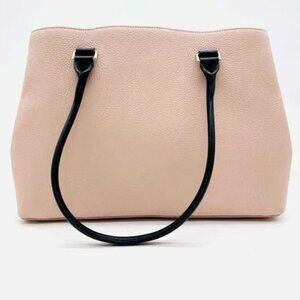 Blush pink pebbled leather tote with black handles and a bow accent. Spacious, structured, and chic perfect for work, school, or everyday carry.