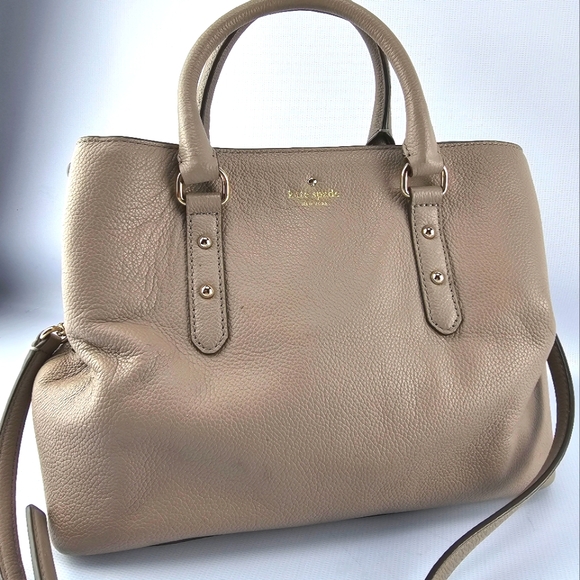 Kate Spade New York Larchmont Avenue Evangelie City Scape Grey pebbled cow leather handbag/ satchel/ purse. Grey jaquard logo print lining with gold hardware. Two outer compartments with magnetic closures & a center compartment with zipper. Inner phone pockets & small zip pocket. Dual handles Includes adjustable crossbody strap.