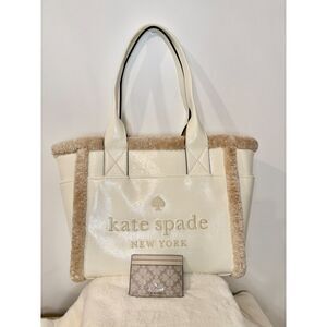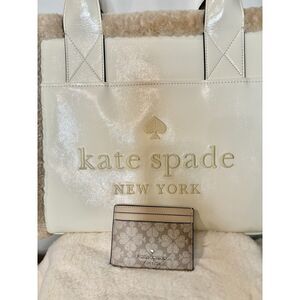 Tote retailed $459 alone! Brand new with tags, never used. The holy-grail winter combo: glossy Meringue patent faux leather + plush Winter White faux shearling trim, paired with the exact-match Spade Flower slim card holder. Almost impossible to find together NWT!