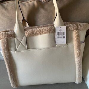 NWT Kate Spade New York Large Tote with faux shearling trim around the borders in Winter White. Large Slip pockets on the front and sides. Large zipper pocket on the inside. Kate Spade New York is embroidered in the front of the bag. Closure with a zipper on the top.
