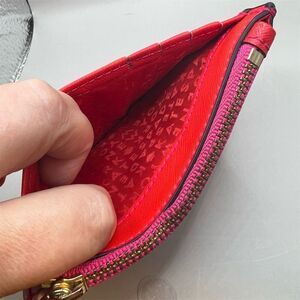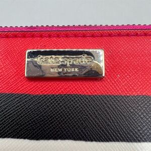 This Kate Spade card wallet is designed for women and features a multicolor striped pattern. Made from durable Saffiano leather, it includes a logo accent and is suitable for holding credit cards. The wallet measures approx 5" x 3 1/2" . It is pre-owned and in excellent used condition, with two very light pink marks. See pictures for details.
