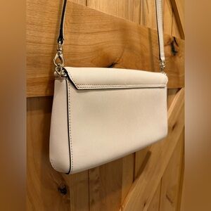 The Kate Spade New York Laurel Way Greer Crossbody Shoulder Bag in Light Pink is a stylish and versatile accessory for women. This medium-sized bag features a crossbody strap and can be worn for various occasions including parties, work, or casual outings. The bag is made of leather with a black fabric lining, accented with gold-plated hardware and a magnetic and zip closure. It includes interior pockets, a mobile phone pocket, and a detachable strap for added convenience. The classic design with strap accents and a chain strap detail makes it a timeless piece from the designer brand kate spade new york.