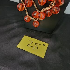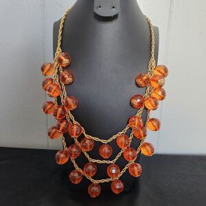 This necklace features three strands of faceted, transparent orange Lucite beads, each capped with filigree details and connected by a gold-tone chain. The necklace measures approximately 23 1/2 inches long. This particular necklace reflects a retro-inspired style, reminiscent of 1970s jewelry. The orange beads and gold-tone accents create a statement piece that can add a pop of color and vintage charm to an outfit.