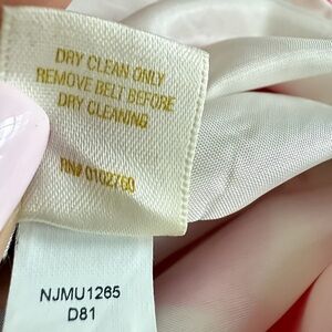 Worn once on a trip. The dress itself is in impeccable, like-new condition. Only note is the belt has peeling on the inside (shown in photos) but is perfect on the outside. This does not affect the overall beauty of the dress.