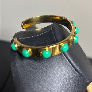 Elegant gold cuff bracelet featuring vibrant green stones. Perfect for adding a touch of sophistication to any outfit.