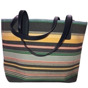 Make your outfit stand out with the colorful stripes and sophisticated structure of this leather-trimmed tote, featuring a trio of compartments for optimal organization on the go.