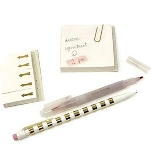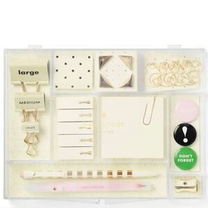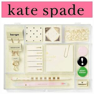 Elegant desk organizer set by Kate Spade. Includes clips, pins, and a pen. Perfect for adding style to your workspace.