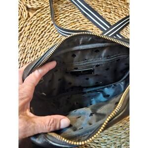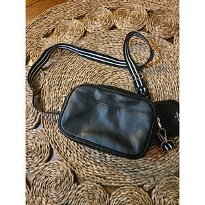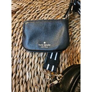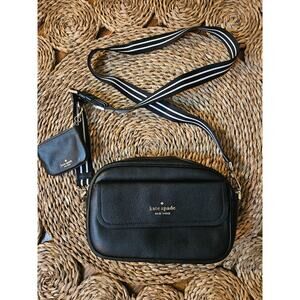 Classic and chic, this genuine Kate Spade crossbody bag is crafted from supple black pebbled leather and comes with a matching coin/change pouch. Features a striped adjustable canvas strap for comfort and style.