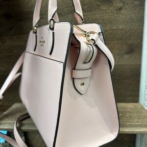 A timeless and feminine Kate Spade satchel in a soft blush pink saffiano leather. Features dual top handles, a detachable/adjustable crossbody strap, gold-tone hardware, protective feet at base, and exterior slip pocket. Zip-top closure opens to a spacious interior—perfect for daily use or workwear.