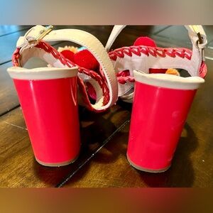 Bring on the color and fun with these eye-catching Kate Spade block heels! Featuring a nude leather base with bold pink stitching, a vibrant pink block heel, and playful multicolor yarn pom poms and tassels. Perfect for summer parties, vacations, or adding a whimsical twist to your outfit.