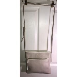 This is a Kate Spade New York Purse. It is a Cross Body style. The strap is adjustable. The color is light Tan and it is textured... Pebble Leather. On the front there is a zipper pocket ant the zipper pull is aTassle. On the inside there is another zipper pocket on the side and on the other side there is a pocket with no zipper. It is very clean and in very good condition despite very very light wearing on trim **See my picture of the green tip marker pointing it out**