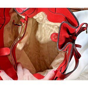 Elevate your style with this bold red leather tote bag from Kate Spade New York. Featuring luxurious gold-tone accents and spacious design, this bag combines fashion and functionality effortlessly. The adjustable bow detailing adds a charming touch, making it a standout accessory for work or casual outings.