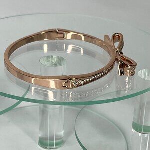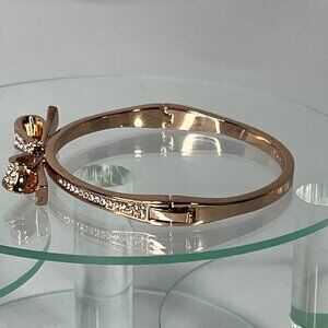 A refined rose gold-tone bangle bracelet featuring a delicate bow design adorned with sparkling crystals. A sophisticated accessory for polished style.