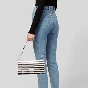 Black and ivory striped patent leather Kate Spade New York Ruby Street Bow Monette bag with gold-tone hardware, single flat shoulder strap with chain-link accents, bow embellishment at front, ivory and multicolor polka dot woven lining, sleek metal logo plate, single zip pocket at interior wall and magnetic snap closure at front flap.