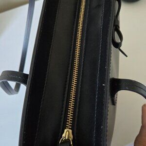 Perfect for casual outfits or office with bow accessory. Dual flat shoulder straps with stamped logo at the front. Three Interior pockets. One pocket with zip closure. Zip closure at the top of tote.