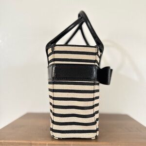 Authentic Kate Spade New York Quinn Villabella Tote Bag and Crossbody. This stylish pair features a classic black and cream striped canvas design with patent leather trim and handles. Adorned with a prominent black patent leather bow and the signature Kate Spade logo plate, it's a chic and versatile accessory perfect for everyday use or special occasions.