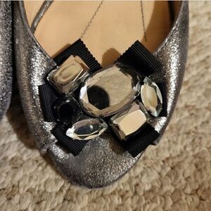 Kate Spade New York Silver Gray Metallic Leather Peep Toe Jewel Trim Flats