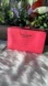 Bold pink wallet with sleek design. Features gold logo detail. Ideal for daily essentials. Pre-own condition, has coins re4.5" h x 5.5" w x 1" d saffiano leather with ksny metal pinmount logo two-way spade jacquard lining interior:8 credit card slots, id window, 4 slip pockets, 2 bill folds exterior: l-zip coin, compartment snap closure.